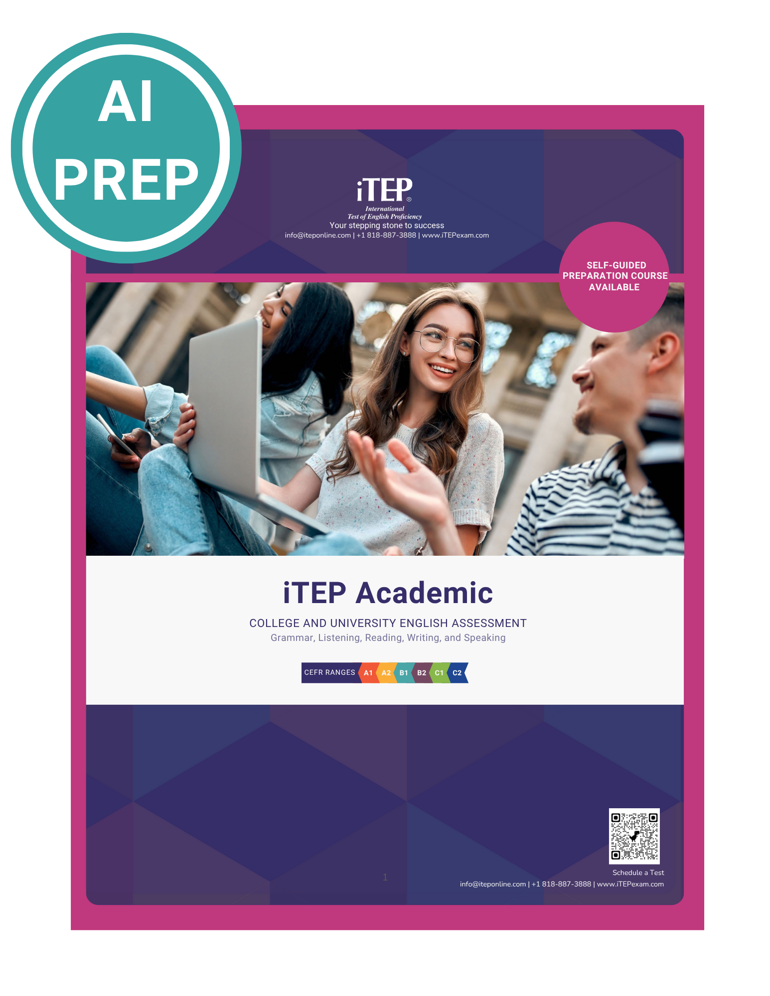 Prepare for success on the International Test of English Proficiency (iTEP) with our AI-driven practice platform. Designed to mirror the real exam experience, our comprehensive practice tests help you build confidence and improve your English proficiency across all five sections: Grammar, Listening, Reading, Writing, and Speaking. Students can get immediate feedback on their Writing and Speaking scores – aligned with iTEP Scoring on the real exams
